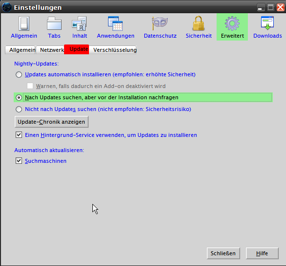 Wenn ich es Firefox selber machen lasse, aktualisiert er Add-ons ohne Meldung. Das will ich nicht und deshalb wurde das Add-on entwickelt. Oder gibt es da noch was zum drehen, dass Firefox Updates meldet und nicht automatisch aktualisiert? Ich hatte Add-ons, bei denen das neueste Update fehlerhaft war. Ich musste also zum vorherigen Stand zurück und warten, bis ein neues Update kam. Ich will also eine Meldung, wenn ein neues Update zur Verfügung steht, aber kein automatisches Update.
