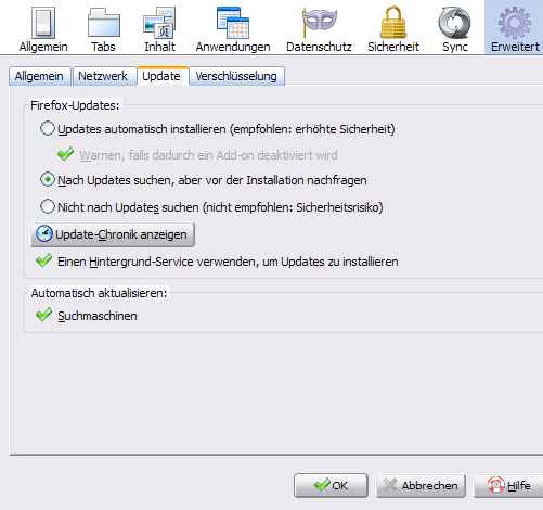 An dieser Stelle hatten frühere Versionen noch eine separate Einstellung für das Update der Erweiterungen. Die ist jetzt weg und seither updatet Firefox die Erweiterungen ohne Nachfrage.