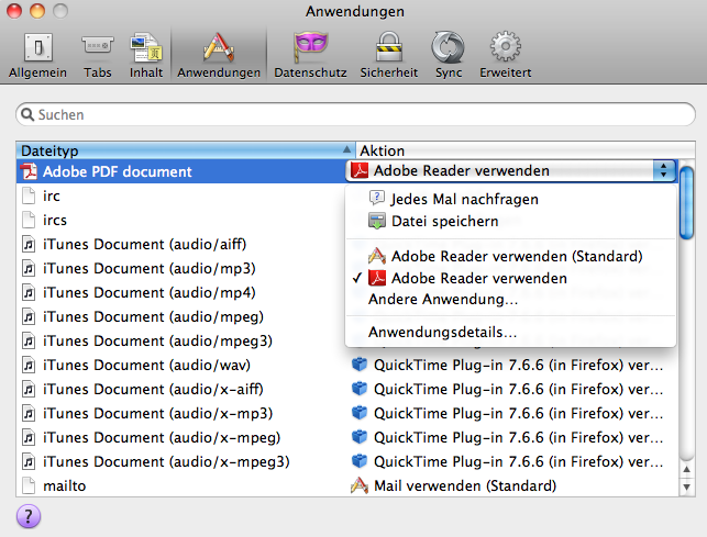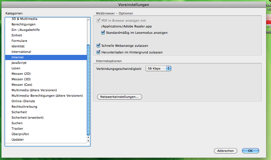 ich habe seit ein Paar Tagen das gleiche Problem (Info: bezieht sich auf diesen Thread). Derzeit nutze ich Firefox Version 11.0 auf meinem Macbook. Für PDFs nutze ich den Adobe Acrobat Reeader in der Version 10.1.3. Die Voreinstellungen bezüglich der Betrachtungen von PDFs im Webbrowser habe ich nicht verändert (siehe Screenshot).