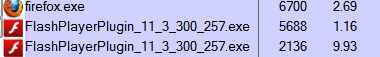 Jetzt nach dem Update von FF habe ich sowieso alles so wie vorher und wie es sein sollte. Auch 2 gleiche Prozesse der FlashPlayerPlugin_11_3_300_257.exe im ProzessExplorer.
