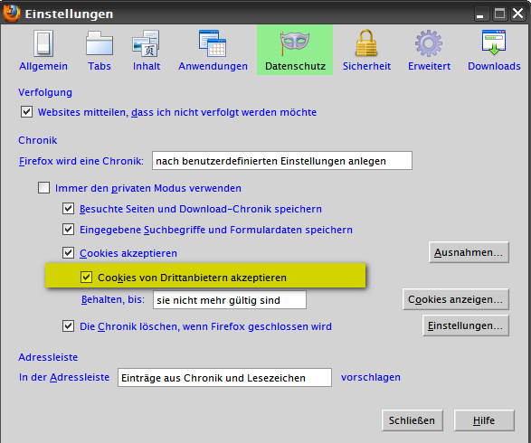 Der Haken ist vorhanden bei - Cookies von Drittanbietern akzeptieren