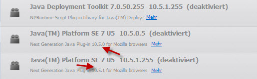 Hallo, vor ein paar Tagen habe ich ein Java-update durchgeführt. Dabei wurde mir automatisch das upgrade von Java 6 auf Java 7 installiert. Bei meinem System (XP SP3) entdeckte ich anschließend im FF 13.0.1. bei den aufgeführten plugins einen (für mich) komischen "Doppeleintrag" (siehe Dateianhang). Und zwar befindet sich dort sowohl ein Eintrag für die Version 10.5.1. als auch für die offenbar ältere 10.5.0. Beide Einträge werden offensichtlich durch die selbe Datei npjp2.dll verursacht, wie ich über about:plugins herausgefunden habe.