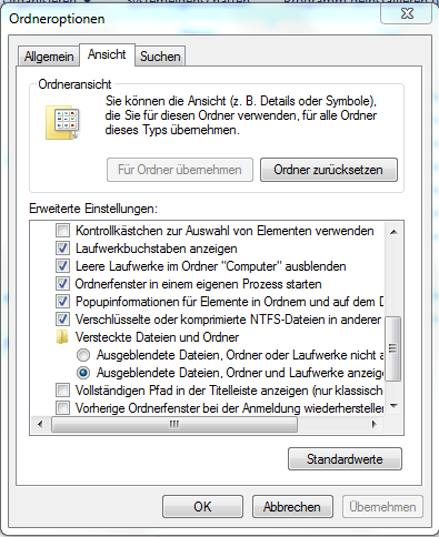....... muss man sich diese im Windows-Explorer per Extras :arrow: Ordneroptionen :arrow: Ansicht :arrow: Erweiterte Einstellungen: :arrow: Versteckte Dateien und Ordner anzeigen lassen. Setze die Marke auf Alle Dateien und Ordner anzeigen. Entferne auch gleich noch die Haken unter Dateien und Ordner bei Erweiterungen bei bekannte Dateitypen ausblenden und geschützte Systemdateien ausblenden. Setze den Haken bei Inhalte von Systemordnern anzeigen. -